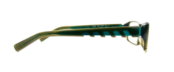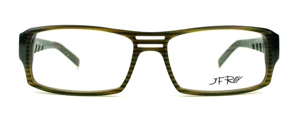 Made in France, these new rectangular shaped frame have an stylish strip effect in shades of green and khaki with a double bridge. Green and teal open work detail along the temple sides add to the classic JF Rey style.